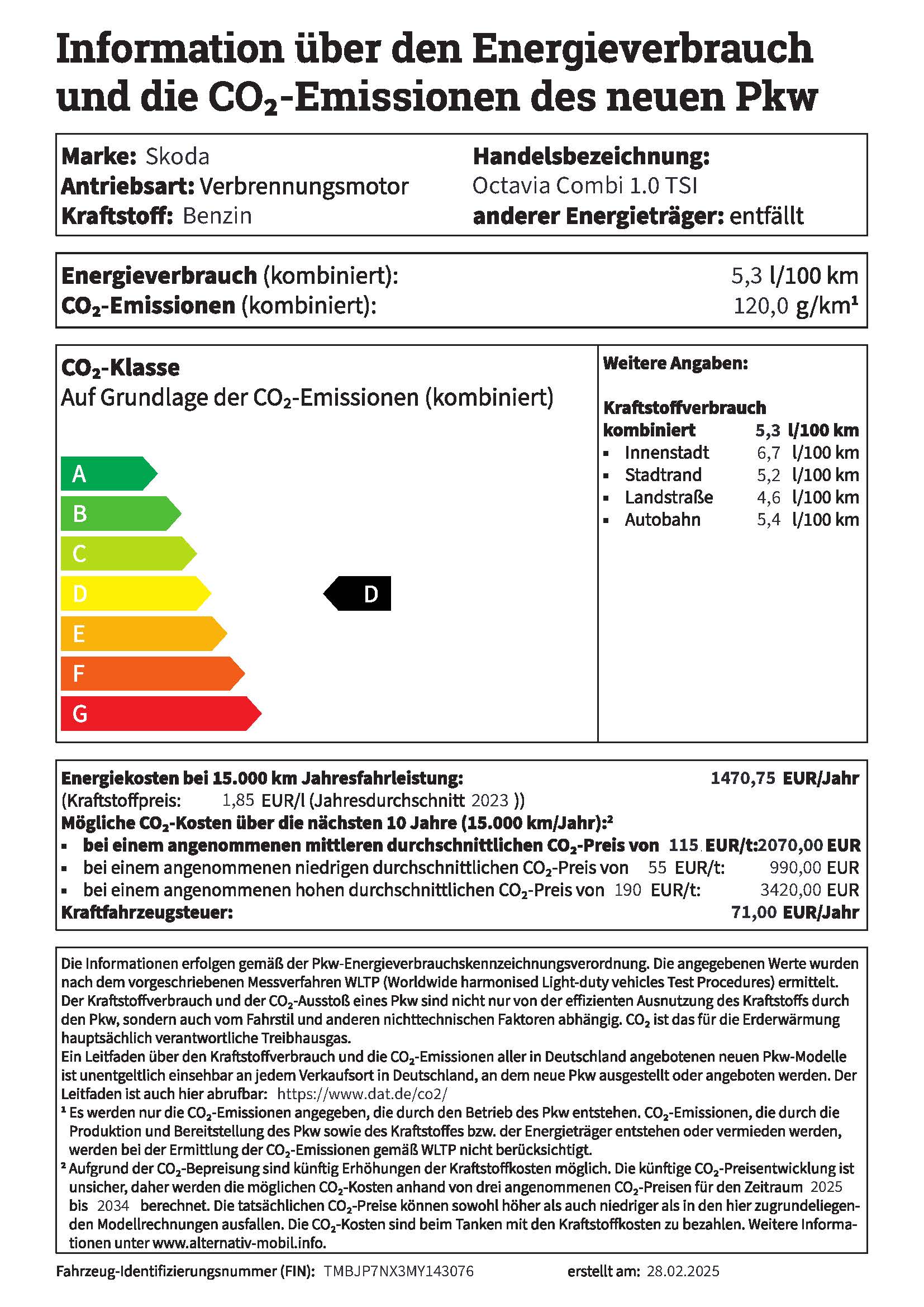 Energiekosten bei 15.000 km Jahresfahrleistung:(Kraftstoffpreis:1,85 EUR/l(Jahresdurchschnitt 2023)) 1471,00 EUR/Jahr